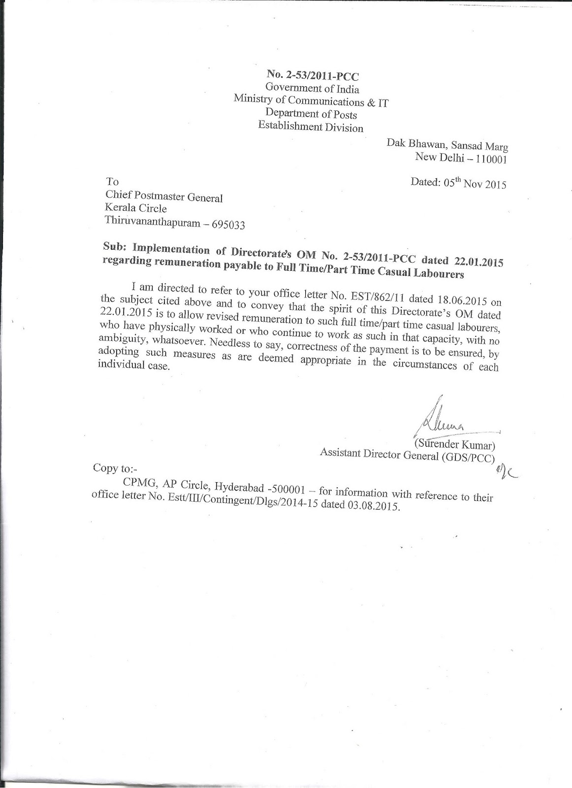 D.G. Posts letter No. 2-53/2011-PCC dated 05 November, 2015 (Addressed to CPMG Kerala Circle).